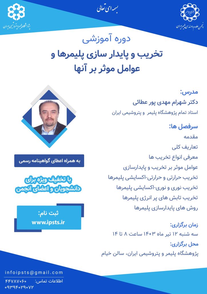 دوره آموزشی ” تخریب و پایدارسازی پلیمرها و عوامل موثر بر آنها ” با تدریس جناب آقای دکتر شهرام مهدی پور عطائی در تاریخ 12 تیر ماه 1403 در پژوهشگاه پلیمر و پتروشیمی ایران برگزار شد.