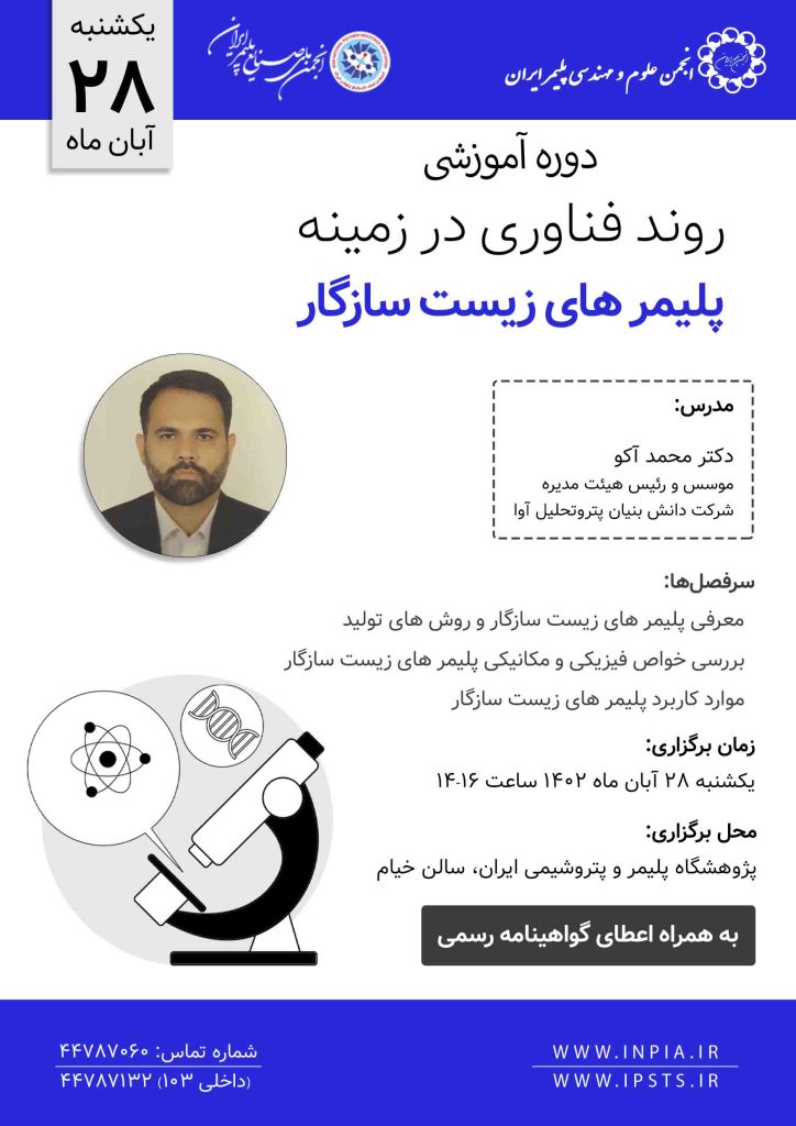 توسط مدرس جناب آقای دکتر محمد آکو با همکاری انجمن علوم و مهندسی پلیمر ایران و انجمن ملی صنایع پلیمر ایران در تاریخ 28 آبان ماه 1402 در پژوهشگاه پلیمر و پتروشیمی ایران برگزار شد.